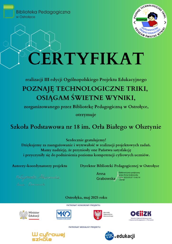 Projekt Edukacyjny „Poznaje technologiczne triki, osiągam świetne wyniki” przez Michał · 21 maja 2025 Klasa 5c w ramach lekcji informatyki brała udział w Ogólnopolskim Projekcie Edukacyjnym „Poznaje technologiczne triki, osiągam świetne wyniki”